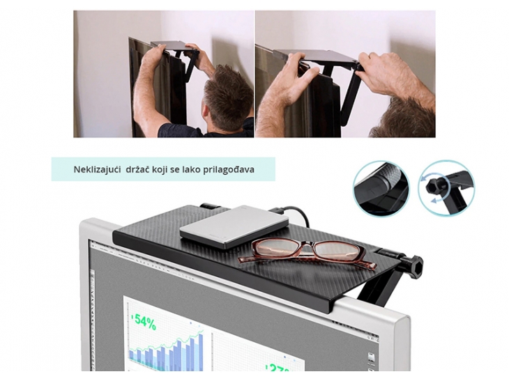 Sada ćete konačno imati gde da spustite daljinski, slušalice, sjajno je mesto za ruter, kao i za zvučnike. Ona će vam biti prostor za stvarčice koje vam se gube po prostoriji ili vam smetaju na stolu, a neće zauzimati nikakvo dodatno mesto jer se kači na gornji deo televizora ili monitora.