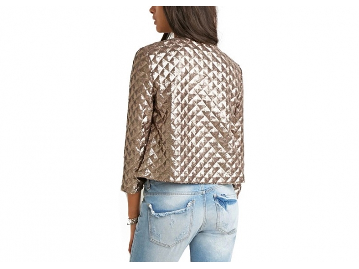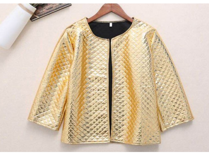Reljefasti dezen jakne i zlatna boja čine je veoma jakim detaljem, zato je bolja za izlaske i šetnje po gradu nego za posao.